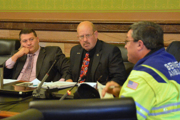 State Senators Steve Sodders of State Center (left) and Rich Taylor of Mount Pleasant (middle) listen closely as Orville Randolph, president of the all-volunteer Bennett Ambulance Service (right), addresses the Iowa Legislature's Emergency Medical Services Study Committee at the Iowa ...