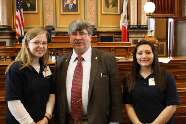 On Wednesday, March 20, Rep. Dean Fisher (R-Garwin) hosted Breanna Dailing (left) and Savanna Patterson from the Iowa Juvenile Home in Toledo at the State Capitol. Dailing and Patterson spent the day job shadowing legislators. They are pictured in the House Chamber.