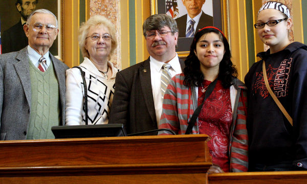 On Thursday, March 28, Rep. Dean Fisher (R-Garwin) hosted Tama County constituents at the State Capitol. Pictured are Bob and Mildred Mason, Rep. Fisher, Gisselle Verdinez and Alejandra Bly.