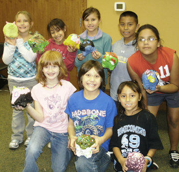 Shown with the paper mache piggy banks they made were: Ryley, Javin, Lily, Aubrey, Monserrat, Abby, Tavian and Celia. Participants not pictured are Jazmin and Elania.