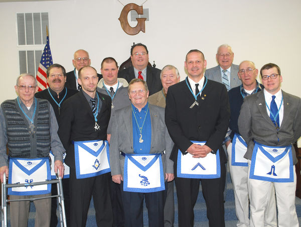 Shown above are the 2011 Masonic Officers and Installing Officers of Hiram of Tyre Lodge #118. 1st row: Charles Patterson, Treasurer; Dan Quigley, Jr. Deacon; Dennis Mallory, Senior Steward; Greg Johnson, Worshipful Master; Brian Oliver, Senior Warden. 2nd Row: Randy Arp, Tyler; Curt Raue, Senior Deacon; Ted Hall, Junior Steward; Ron Garrett, Junior Warden. 3rd row: Gene Anderson, Secretary; Terry Osborne, Installing Master; Richard Osborne, Installing Marshall.