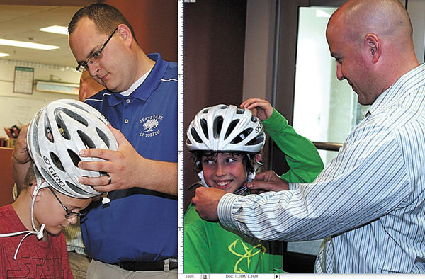 Meskwaki Settlement School 3rd grader Kalayna White is fitted for her new bike safety helmet by her teacher, Camara Cosgrove, during the 21st annual Grinnell Regional Medical Center distribution on Friday, May 8. A total of 541 new bicycle helmets were given free-of-charge to area 3rd grade ...