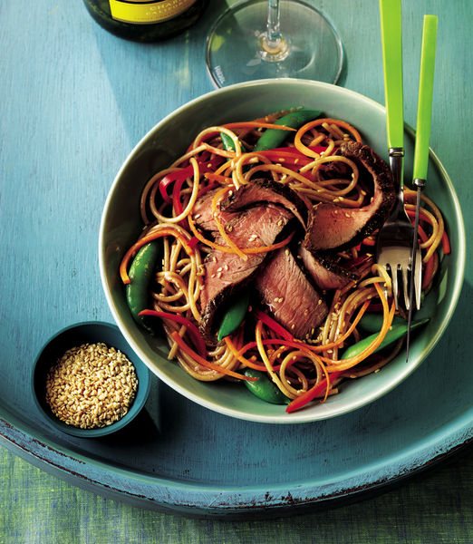 Combine cooked whole wheat or regular thin spaghetti with sugar snap peas, shredded carrots and thinly sliced red bell peppers. Combine equal amounts Asian vinaigrette and hoisin sauce. Drizzle over pasta and vegetables; toss to combine. Top with grilled steak slices and toasted sesame seeds.