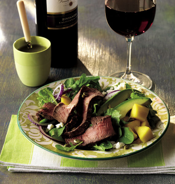 Top mixed baby salad greens with cubed fresh mango, sliced avocado and red onion, toasted pumpkin or sunflower seeds, crumbled queso fresco cheese and grilled steak slices. Drizzle salad with lime vinaigrette.