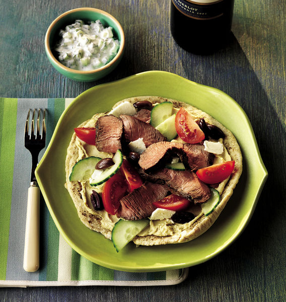 Spread pita or flatbread with hummus. Top with sliced cucumbers and tomatoes, chopped Kalamata olives, crumbled feta cheese and grilled steak slices. Serve with plain yogurt combined with finely diced cucumber and minced garlic.