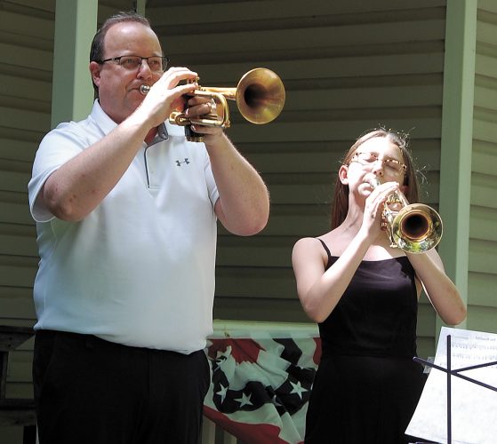 South Tama band director Mike Carnahan is joined by his daughter, Emily, in the Taps Across America observance at 3 p.m. CST, Monday, May 25,from their front porch in Tama. The event was held nation-wide to commemorate Memorial Day as many ceremonies were cancelled this year due to COVID-19 ...