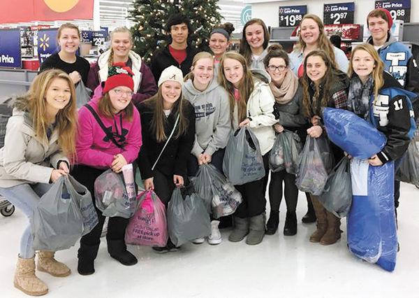 The South Tama County High School National Honor Society with the help of Dan Lopez and Marlys Upah adopted 20 individuals and shopped for them for the Adopt-A-Family program. This is the second year the Honor society has participated. First row: Mahayla Doyle, Madison Stull, Stephanie Slaven, ...