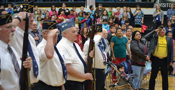 Veterans and students from South Tama Middle and High schools pay respect during ceremonies at the high school gym on Thursday, Nov. 10, during ceremonies marking Veterans Day on Friday. Area veterans were invited to attend. Members of the Reinig-Friedrich Post 72 Toledo American Legion and ...