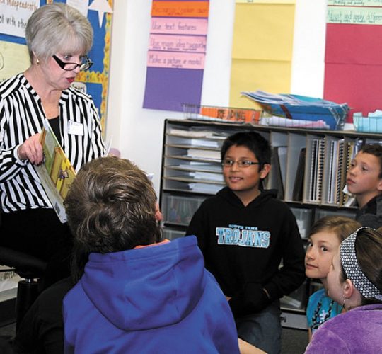 Iowa First Lady Chris Branstad reads to students including (l-r) Amare Chavez, Pedro Munoz, Maeley Elsbury and Zophia Zmolek in Deloris Ryan's 4th grade class at the South Tama Elementary School on Monday morning, April 18. Branstad has read to other classes taught by Ryan over the years as ...