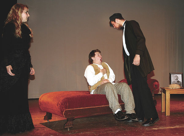 In a scene from The Sneeze, grieving widow Popoca (Sadie Kavalier) is interrupted from her mourning by enraged landowner Smirnov (Daryl Bidwell). Popova's footman Luke ((David Bennett) attempts to ease the tension in this humorous battle of the sexes. The South Tama High School Drama Department ...