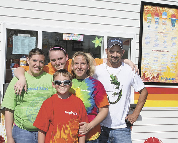 The crew at Heather’s Tropical Sno are left to right- Jamie Meyer, Lacey Timm, Brice Timm, Heather Timm and Rob Rauch. The new stand in the Pamida Store parking lot in Toledo features Hawaiian Shave Ice and is already proving to be a popular summer treat here, Heather Timm says. Chronicle/John Speer