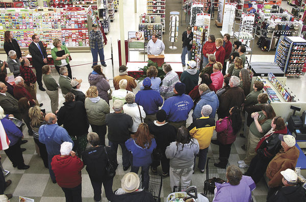Shopko Hometown manager?Cliff Havens (center, back) addresses a big crowd at the store grand opening in Toledo on Thursday morning, Nov. 29. Conversion of the retailer on south County Road (U.S. Highway 63 from the Pamida brand was recently complete Chronicle/John Speer