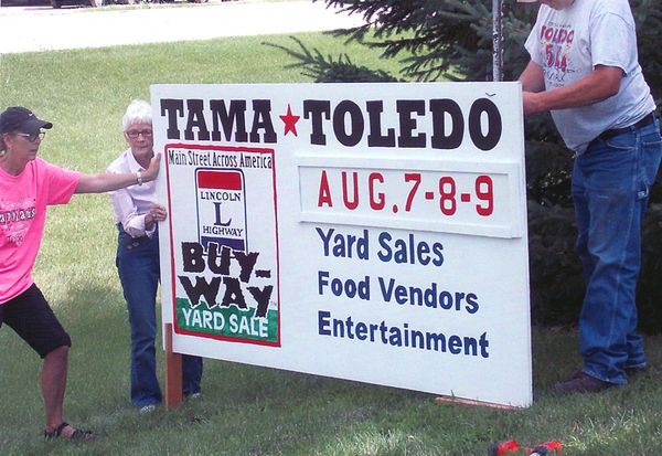 Dana Davis-Hanson, Coleen Davis and Gary Sieck were busy last week putting up signs for the Lincoln Highway Buy-Way sales which run along the historic route in Tama and at the Lincoln Highway Bridge Park on Aug. 7-9. -Photo provided