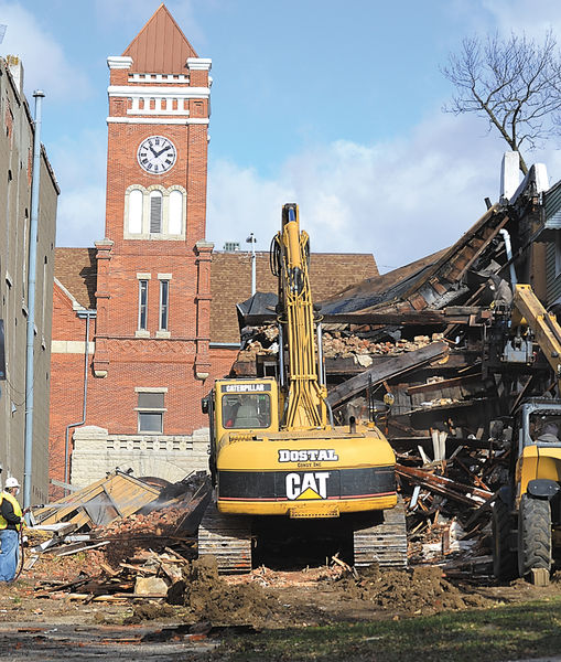 - The facade on the downtown Toledo business building at 119 West High St. was one of last portions to fall when Dostal Construction tore the damaged structure down on Thursday morning, Nov. 6. Chronicle photos/John Speer