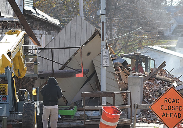 It took just over two months to set the procedure, get bids and obtain Iowa Department of Natural Resources go-ahead, but it took only about five hours on Thursday morning, Nov. 6, for the Dostal Construction crew assisted by City of Toledo workers to level the damaged business building at 119 West High St.