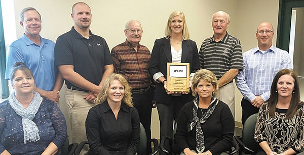 Independent Insurance, Toledo, recently was presented with a plaque recognizing their 50 years representing EMC?Insurance locally. Harlan Dirks, now retired) ((third from left, back row) first signed the contract in 1964. On hand were Independent Insurance employees (front, l-r) – Toni Chaska, Brenda Adams, Tara Kaufman and Marcia Hoskey. (Back, l-r) – Randy VanDyk, Matt Zmolek, Dirks, Jessica Hendricks EMC?representative, Jake Jacobson and Mike Thede.