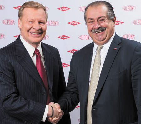 - RIGHT- Edward D. Breen, Chairman and CEO of DuPont, and Andrew N. Liveris, President Chairman and CEO of Dow pose for a handshake upon announcement of an agreement to merge the two companies. -Dupont media photo