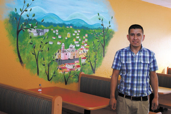Armando Hernandez is shown in the family’s El Cerrito Mexican Restaurant in downtown Tama. The painted wall mural depicts the family’s ancestral home of El Cerrtio in Mexico. News-Herald/John Speer