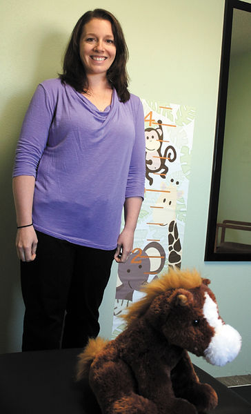 Giovanna Seitz, D.C. is shown in her new Toledo office on Friday, June 17. With the doctor is a stuffed toy horse especially designed to help demonstrate treatment to aid young children in understanding- an area Dr. Seitz will focus upon. Chronicle/John Speer