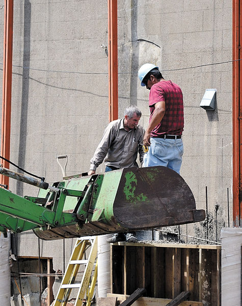 LEFT- In this July 28 photo, Allan Richards (left) directs work on the downtown Toledo Building at 121 West High. The east wall along a north-south alley was under repair. Chronicle/John Speer