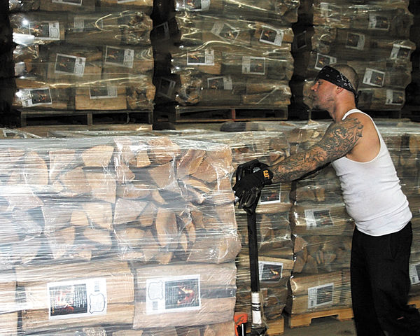 - The packaged, kiln-dried firewood is stacked on pallets to await distribution to retail locations.