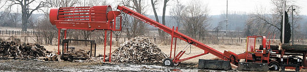 The Blockbuster Firewood Processor with the added “tumbler” combine to transform the rough logs below into split pieces as part of the firewood process.