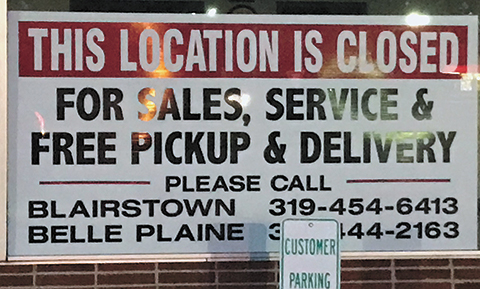 A sign prominently displayed on the front of the car showroom states the location is for sale and for customers to contact Thys locations in Belle Plaine and Blairstown for sales and service. Tama County online property tax records list Joel Thys as the sole owner of the property.