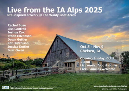 Visitors to the exhibit are welcome to visit with the farm animals, wander the forests and fields of Windy Goat Acres, and to explore the unique artwork created by local and regional artists. Live from the Iowa Alps will open on Sunday, Oct. 5 from 1-3 pm. Live music by Buz Owen will be performed, hot dogs and s’mores will be available around a campfire, and drinks will be available through Windy Goat Acres’ garden bar. The exhibit is free to the public, but donations to the farm will be accepted. Families are welcome. For questions, please contact exhibit organizer Joshua Cox at joshuacox99@gmail.com.