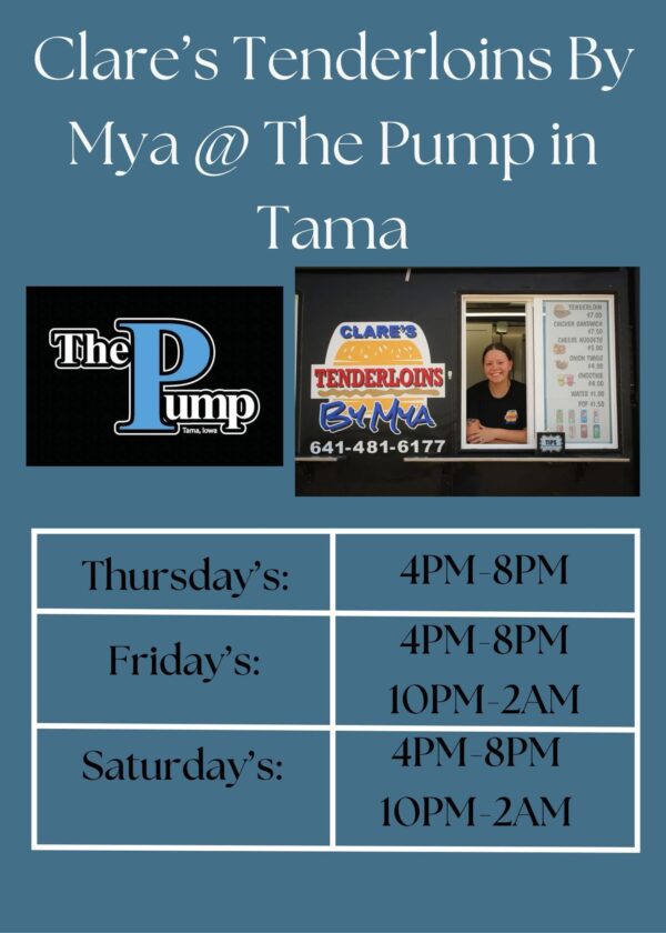 After a strong first season serving Tama-Toledo from her food trailer, Mya Cowell of Clare’s Tenderloins by Mya is keeping the momentum going through the winter months — this time from inside The Pump in Tama.