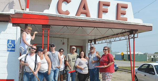 -Employees of the King Tower Cafe on Tama's east edge pitched in on their day off on Tuesday to begin repainting the exterior of the 80-year-old landmark business in the orignal red and white colors. Jimmy (Vlaznim) and Lejka Arifi (third and fourth from right) have purchased the business after ...
