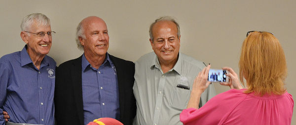 Jim Roan, bank board chair, Dr. Mike Mickelson,principal shareholder of The State Bank of Toledo, and John Kavalier, bank president, are photographed by Roan's daughter, Laura Roan, during the bank festivities on Thursday evening, Sept. 18.