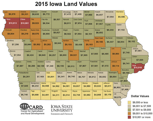 Farm ground in Tama County was down 6.72 percent in value to $7,985 per acre according to the 2015 Farmland Value Survey conducted by the Center for Agriculture and Rural Development in the Economics Department at Iowa State University and Iowa State University Extension and Outreach. The ...