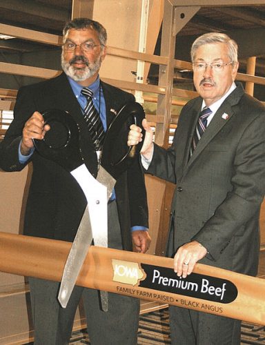 Iowa Governor Terry Branstad and Jeffrey Johnson, CEO of Iowa Premium Beef in Tama, cut the ceremonial ribbon to mark the soon-to-be-opened Iowa Premium Beef plant on Tama's east side on Thursday morning, Oct. 23, 2014. The Governor praised the expected employment of 600 at the plant and said ...