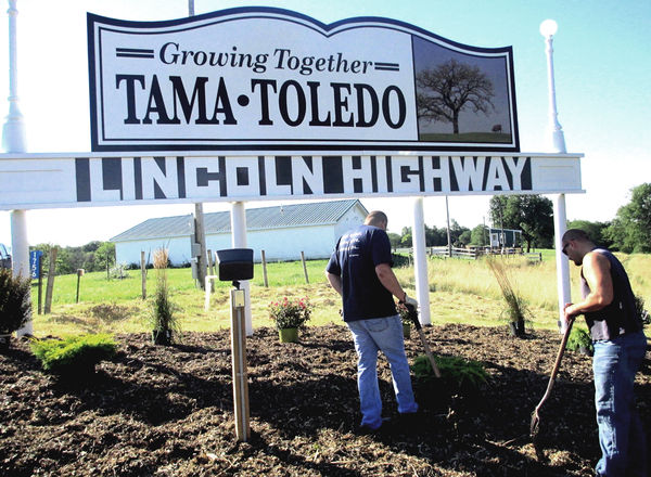 Landscape work around the Tama-Toledo Area Chamber of Commerce welcome signs west of Toledo (left) and east of Tama is shown in progress on Saturday, Aug. 3. Chamber member volunteers completed the work. Among those helping out were Jeff Upah, Brian Sokol and Matt Zmolek. The sign on the U.S. ...