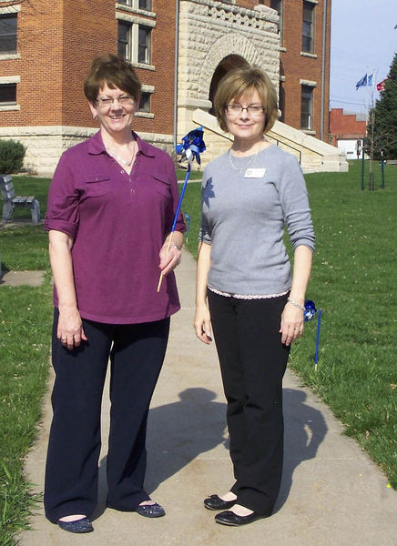 Joyce Legg RN, and Linda Rosenberger, executive director of Tama County Public Health and Home Care display one of the many pinwheels placed on the lawn of the Tama County Courthouse to promote child abuse prevention through the “Pinwheels for Prevention” program. -Photo provided