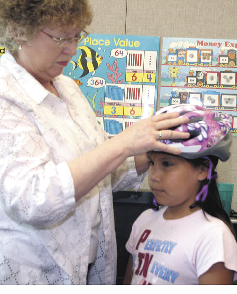 RIGHT- Kaitlynn Jefferson, a 3rd grade student at Meskwaki Settlement School, is fitted for a new bike helmet by Micki Ferris, State Bank of Toledo assistant vice president, on May 11. GRMC and school staff assisted with the annual distribution of which the bank has been a supporter of for many years. Chronicle/John Speer