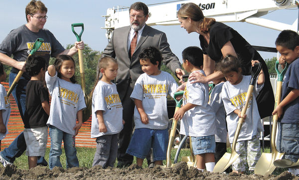 Meskwaki students joined in the ground breaking ceremony. on Sept. 21, 2007, for the new Settlement High School. Having their own high school had long been a goal for Tribal members. Superintendent Jerry Stephens and PrincipalJill Herink assist the students. News-Herald file/ John Speer