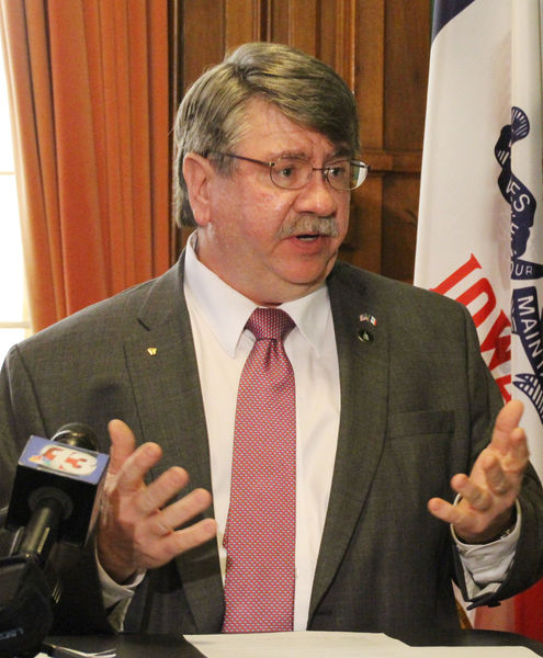 - LEFT– State Rep. Dean Fisher (R-Garwin) explains the proposed Safe at Home Act during a new conference on Thursday in the office of Iowa Secretary of State Paul Pate. Fisher said the measure “is a commonsense solution” which will ensure safety of Iowans. ANOTHER?PHOTO?PAGE 8. -Photo provided