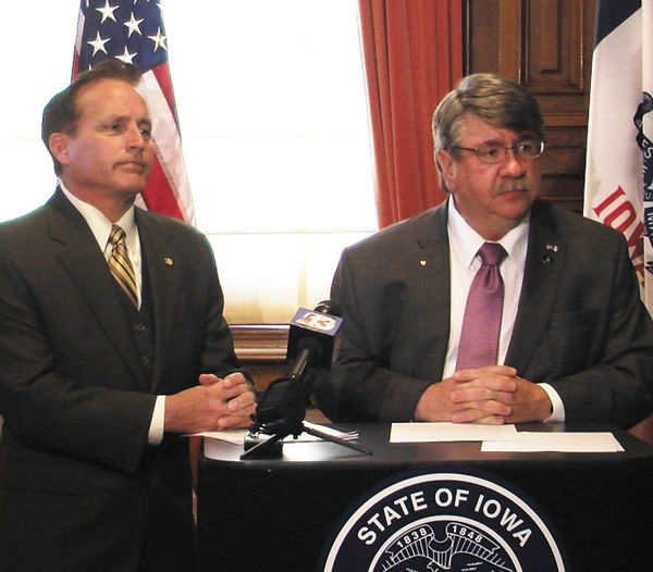 Iowa Secretary of State Paul Pate (left) and State Rep. Dean Fisher (R-Garwin) take questions during a press conference announcing the Safe at Home Act legislation being sponsored by Fisher in the Iowa Legislature this session. STORY, ANOTHER?PHOTO PAGE?1. -Photo provided