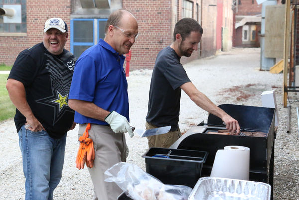 - Tama Paper Board General Manager Greg Aiken (center) Brian Gumm (right) and Steve Chyma grill up some tasty food for Tama Paper Board employees on Thursday, August 6. News Herald photos/Allison Graham