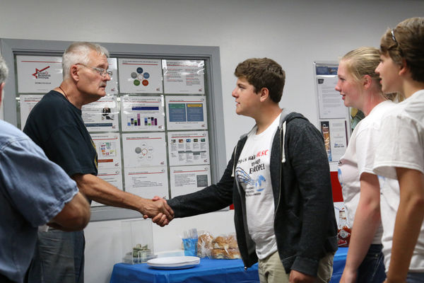 STC students Wyatt Hintermeister, Kaylee Chyma and Lauren Gumm greet Darrell Peska as he comes into the break room for some dinner on Thursday, Aug. 6.
