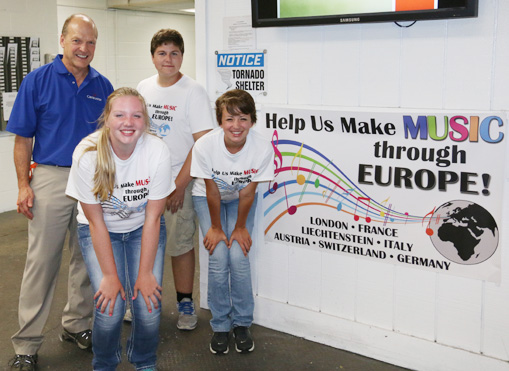 Following a barbeque at the Tama Paper Board the three students raising money for a trip to Europe gathered with Tama Paper Board General Manager, Gregg Aiken (back row, left). Kaylee Chyma and Lauren Gumm are pictured in front with Wyatt Hintermeister in the back on the right. The students will be touring seven countries in Europe in the summer of 2016. The Paper Board and employees donated $3,964 to their fundraising efforts.