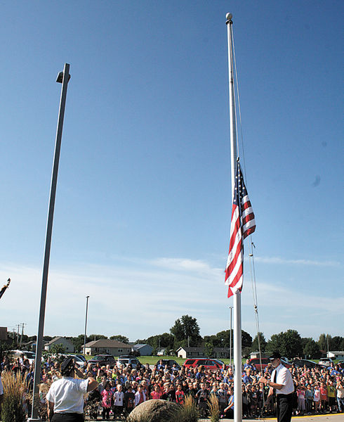Toledo American Legion Post 72 member Pat Johnson raises the U.S. Flag during opening day ceremonies at the South Tama Elementary School in Tama. Students and staff joined in the Pledge of Allegiance and the singing the National Anthem. The Legion Color guard made up of Elizabeth Ledvina, commander and Tama County Veterans Affairs director, Martin Christensen, Don Havran, Bruce McEltree, Laywin Leek and SAL member Byron Witt also took part.