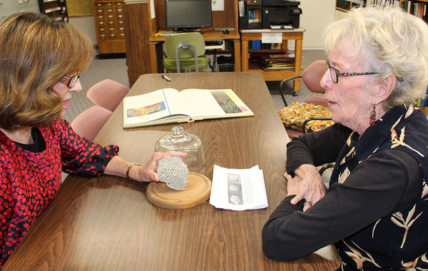 Rosemary DeJoode, Tama, (right) recently presented one of her “finds” - a fossil as identified by the University of Iowa Paleontology Repository. Museum volunteer Virginia Roberts holds the 375 million year old piece which will be on display at the museum.