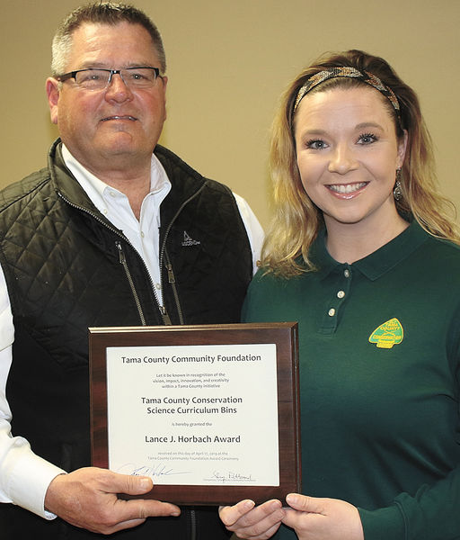 The Lance J. Horbach Award, presented annually by the Tama County Community?Foundation, was received this year by Logan Roberts, director, on behalf of the Tama County Conservation Board in recognition of the Conservation Science Curriculum Bins project. Horbach made the presentation. Horbach was instrumental while serving in the Iowa Legislature for creation of the 85-county program in Iowa to distribute a portion of gambling proceeds to counties who are not the sites of state-licensed casinos.