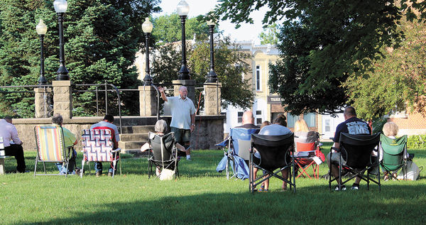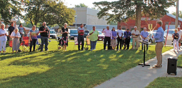 Carter Spore, Dysart, leads in singing of God Bless America as the sun reflects in front of him during services for Tama County’s portion of the Iowa Bible Reading Marathon on the Courthouse Square in Toledo on Sunday morning, July 14.