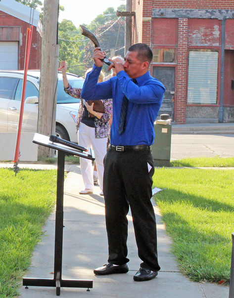 Blowing the shofar at the courthouse gathering were Andres Mejia Perez and John H. Martinez Soicho.