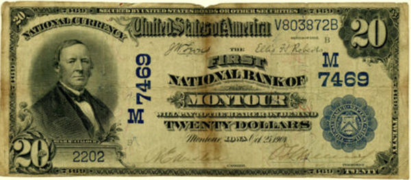 Recently a Tama County resident produced a copy of a $20 bill issued by the First National Bank of Montour, with printing date of October 24, 1904, and signatures of R.E. Austin, cashier and O.L. Millard, President. This has become a topic of conversation for many of those who had connections with Montour.
