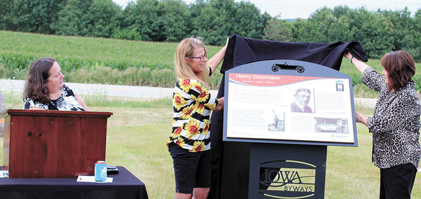 - Montour City Council persons Vicky Garske, left, and Sue Eberhart unveil an interpretive panel honoring Lincoln Highway pioneer Henry Ostermann during a ceremony at Montour’s Maple Hill Cemetery. Looking on at left is Prairie Rivers of Iowa LHHB Coordinator Jan Gammon. Chronicle file/John Speer