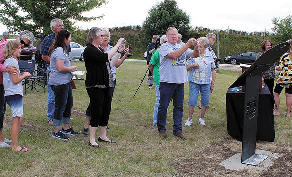 Montour City Council persons Vicky Garske, left, and Sue Eberhart unveil an interpretive panel honoring Lincoln Highway pioneer Henry Ostermann during a ceremony at Montour’s Maple Hill Cemetery. Looking on at left is Prairie Rivers of Iowa LHHB Coordinator Jan Gammon. Chronicle file/John Speer